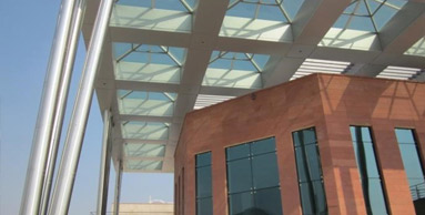 • Building design with overhangs, fins, large windows as well as use of poly urethane foam in walls and roof, double glazing for windows and doors, etc. This ensures maximum natural light in the building while reducing heat conduction from outside. Consequently energy consumption for air-conditioning reduces significantly.