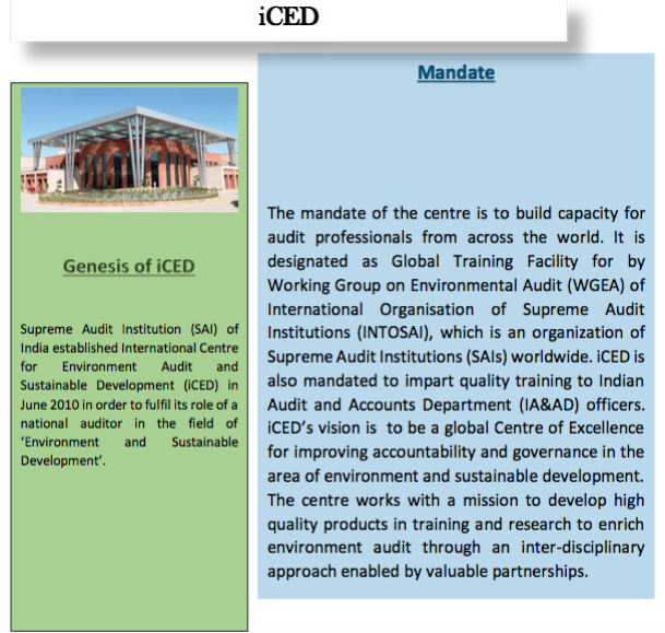 iCED is hub of capacity building at IAAD in the area of Environment Audit. The Centre has provided a platform for national level thinking and experience sharing in the area of environment audit. It has become an interface between expertise in the country on various national and regional environmental issues. This interaction is set to give rise to better contribution by SAI India in the area of environment audit.