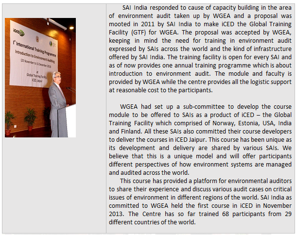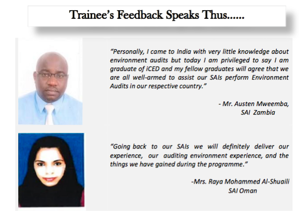 iCED conducted three specialised training programmes which included content on environment audit for SAI Oman. One customised course on Environment Audit was also conducted for SAI Bangladesh in December 2015. This course was conducted over 3 weeks wherein 20 officers / auditors of various levels and backgrounds from SAI Bangladesh participated. Considering the strong ties of SAI India with many other SAIs of the region and the world, iCED looks forward to organising various capacity building activities for them.