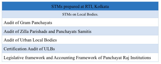 RTI, Kolkata has prepared five STMs on audit of Local bodies. These address audit of Gram Panchayats, Audit of Panchayat Samiti and Zilla Parishad, Audit of Urban Local Bodies. The modules were chiefly based on, among others,