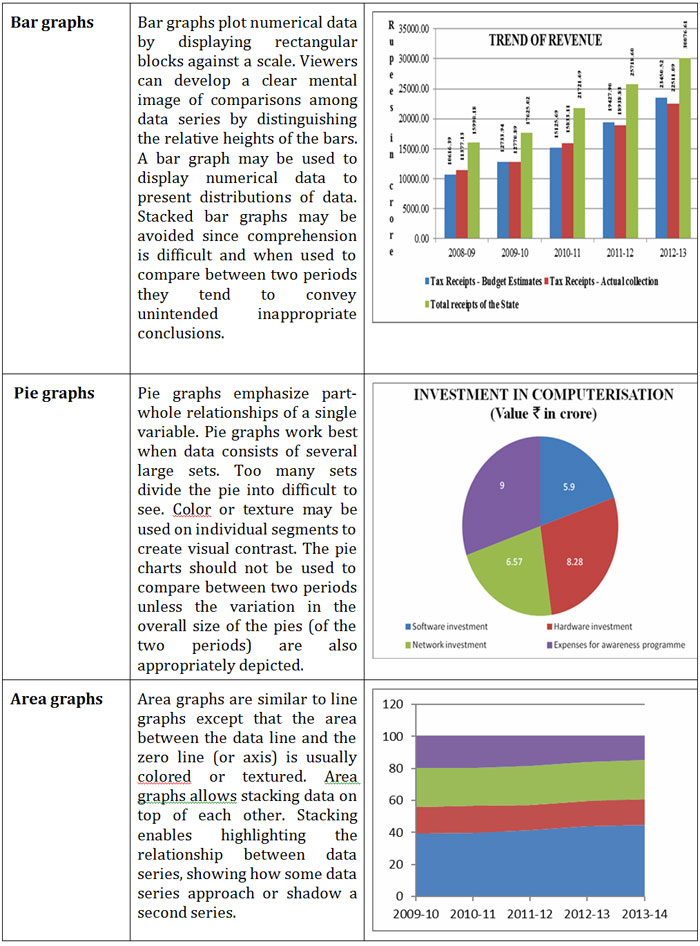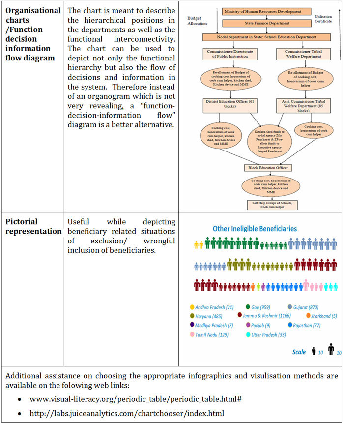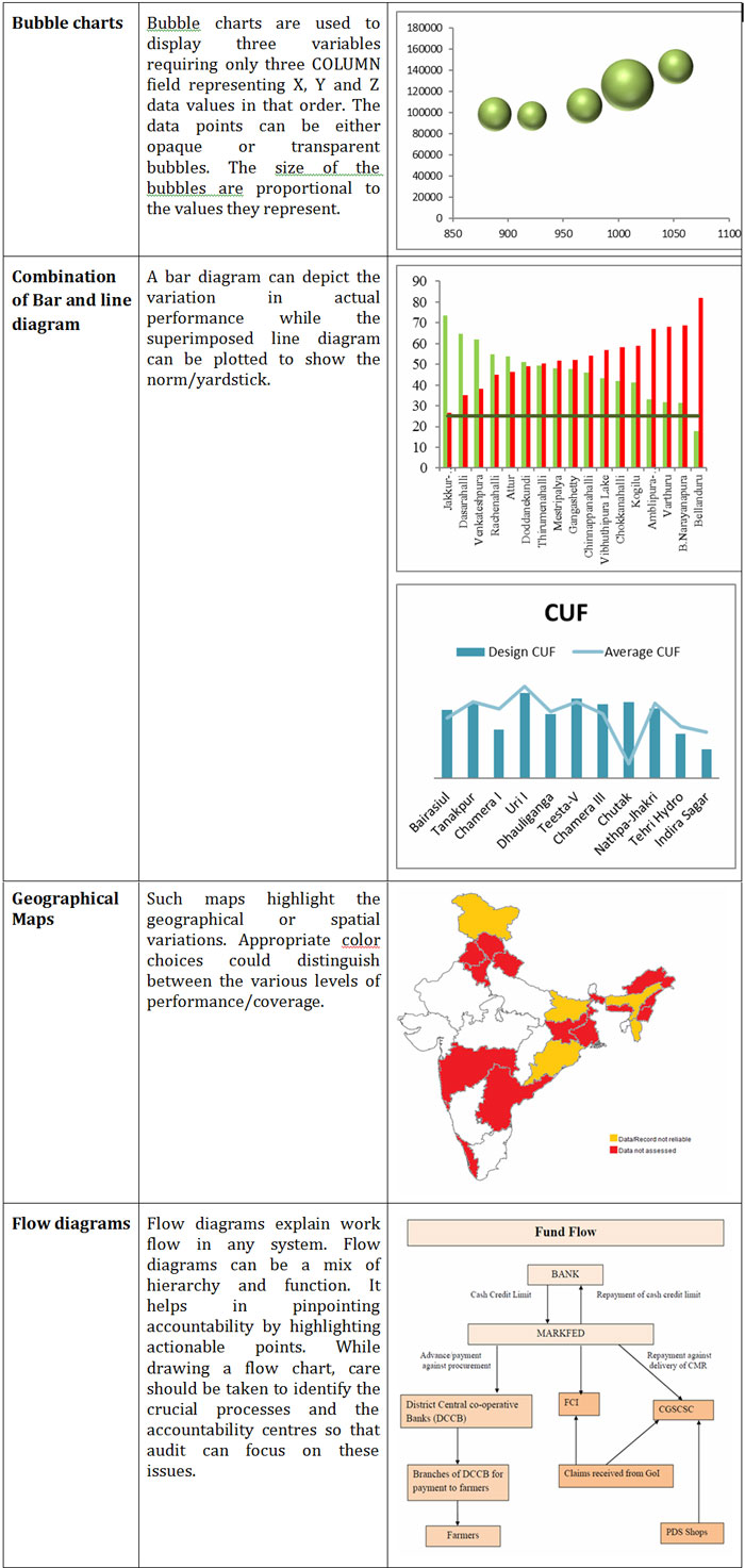 The following table provides an illustrative set of infographs that can aid us in opting for appropriate infographs, which can be used in Audit Reports, financial reports and other products with suitable modifications to address specific situations and contexts.