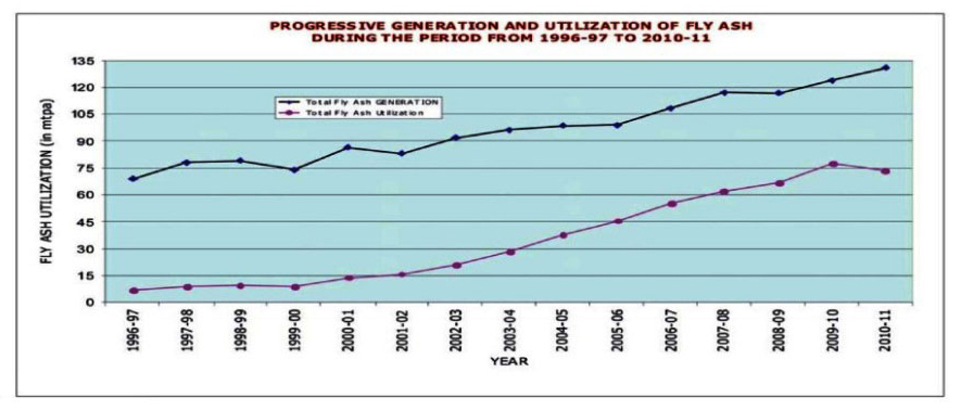 The Central Electricity Authority (CEA) has been working on behalf of Govt. of India(GOI) for effective utilization coal ash. A large number of technologies have been evolved for gainful utilization and effective management of fly ash under the concerted efforts of Fly Ash Mission of the GOI since 1994. However, achievement towards utilization of ash since 1997 is not very encouraging (nearly 50%) in the country particularly when compared with the growth rate of annual fly ash generation as would be evident from the following line chart: